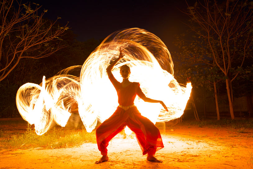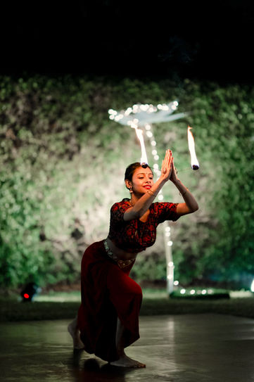 A fire show that draws inspiration from Indian art forms such as Bharatanatyam, Kalari, and Silambam, combining dance and martial weapons.